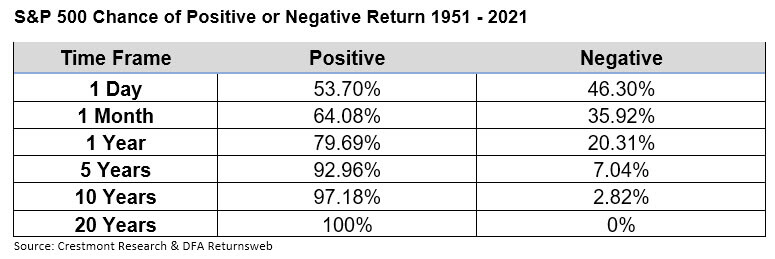 Trying to make every shot perfect is a little like attempting to outsmart the market on short run time frames. You’d have as much success flipping a coin. As time goes on, the market does more of the work and lessens the need for fiddling. There’s always the potential for a negative return, but the passing of time narrows that likelihood. And if there was no chance of a negative return, there would be no risk, and without risk you can’t expect a return at all!