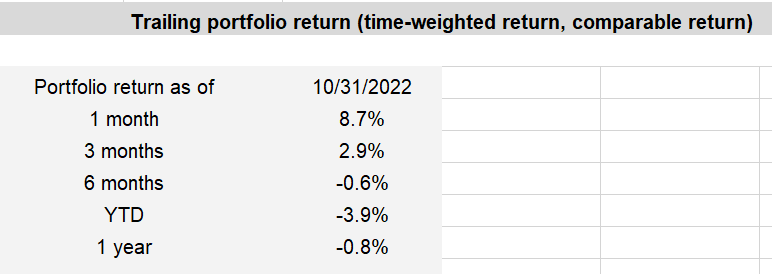 I also sold a portion of a stock I’ve been holding for several years, it’s up significantly over that time so I basically pulled the initial investment and have allowed it to free carry. Of that money, I sent 2.3x the standard monthly contribution, to the portfolio. Unfortunately, the time it takes to realise the money in one account and then the time it takes to send it to the other account, meant I didn’t enjoy the benefit of all the gains that were showered down during October. T+2 and another day waiting for a bank transfer meant missing about 4-5% in the first few days of the month.