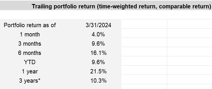 March was a pretty decent month, and it pushed the 1 year return above 20%. I split the contribution between global value and emerging markets. One of the issues when you have seven holdings, and three of them are around 5-7%, is they can feel a little unloved from time to time. They may lag behind and only receive a contribution every so often.